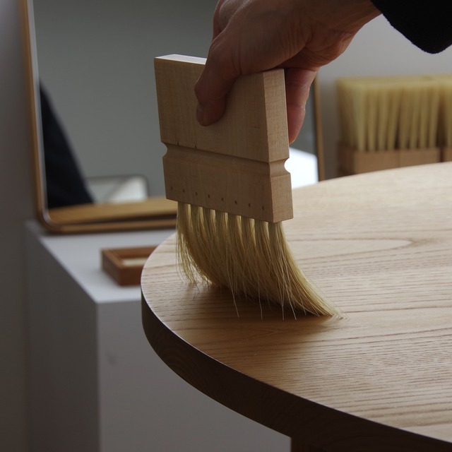 掃除用のブラシです。 はたきのようにほこりを落としたり、手ぼうきのようにテーブルの上を掃いたり、床に落として掃除機で吸うという手順で掃除をする方にはピッタリな道具です。 毛材は適度にコシがあり静電気が発生しにくい植物繊維。 はたきとして使いやすいよう長めにしているのでコシは柔らかめ。 短くすればコシが強くなるので使い勝手や用途に応じて切って調整できます。 以下の3種から選んでいただけます。 中:細かいところも広いとこにも使える丁度いいサイズ 太:テーブルなど広いところの掃除に便利 細:本の天やカメラなど細かいところの掃除にぴったり 毛材は抜けにくいように固定し、更に抑えとして打ち込んだ木釘が見た目のアクセントにもなっています。 どんな大きさの手でも使いやすいように滑り止めとして鋸目を入れたり、少ない力で使いやすいように先端近くに手を添えるためのくびれを付けるなど、使い勝手や耐久性をのために工夫した商品です。 ちり払いブラシ 太 素材 | ヤマザクラ白太(クリアオイル仕上げ)、植物繊維 寸法 | w120 h187 d18mm ※ちり払い以外の用途で使用しないでください。